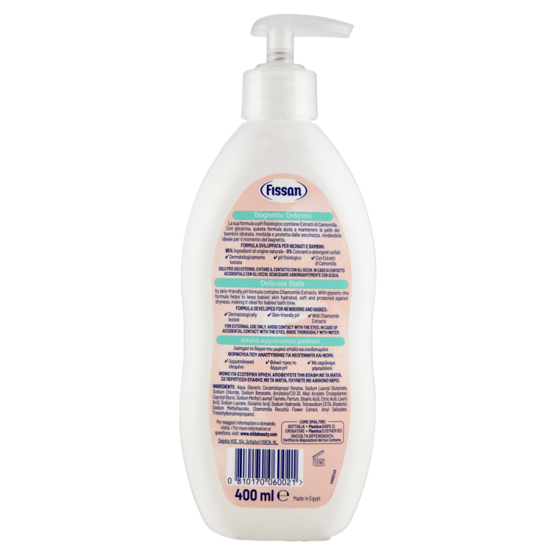 Le Bain Délicat Fissan 400 ml est le nettoyant idéal pour la toilette quotidienne de la peau sensible des nouveau-nés et des enfants . Grâce à sa formule délicate aux extraits de camomille , aux propriétés émollientes et apaisantes reconnues, ce bain nettoyant respecte l'équilibre naturel de la peau, laissant la peau de votre tout-petit douce, hydratée et agréablement parfumée.