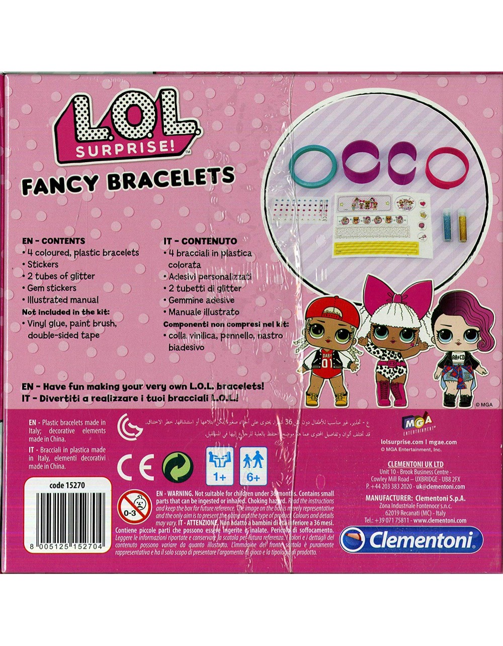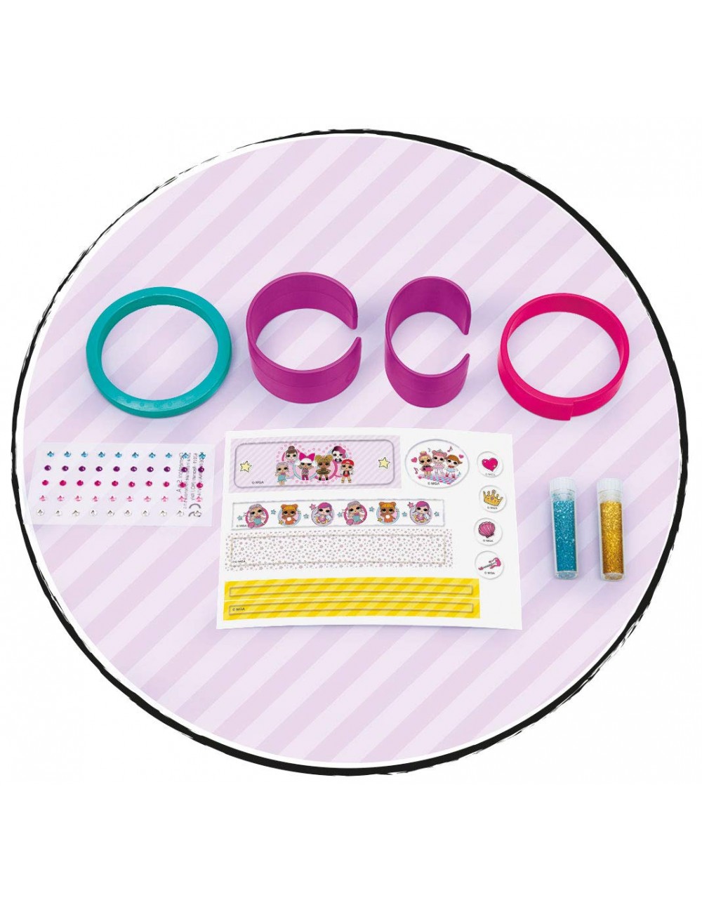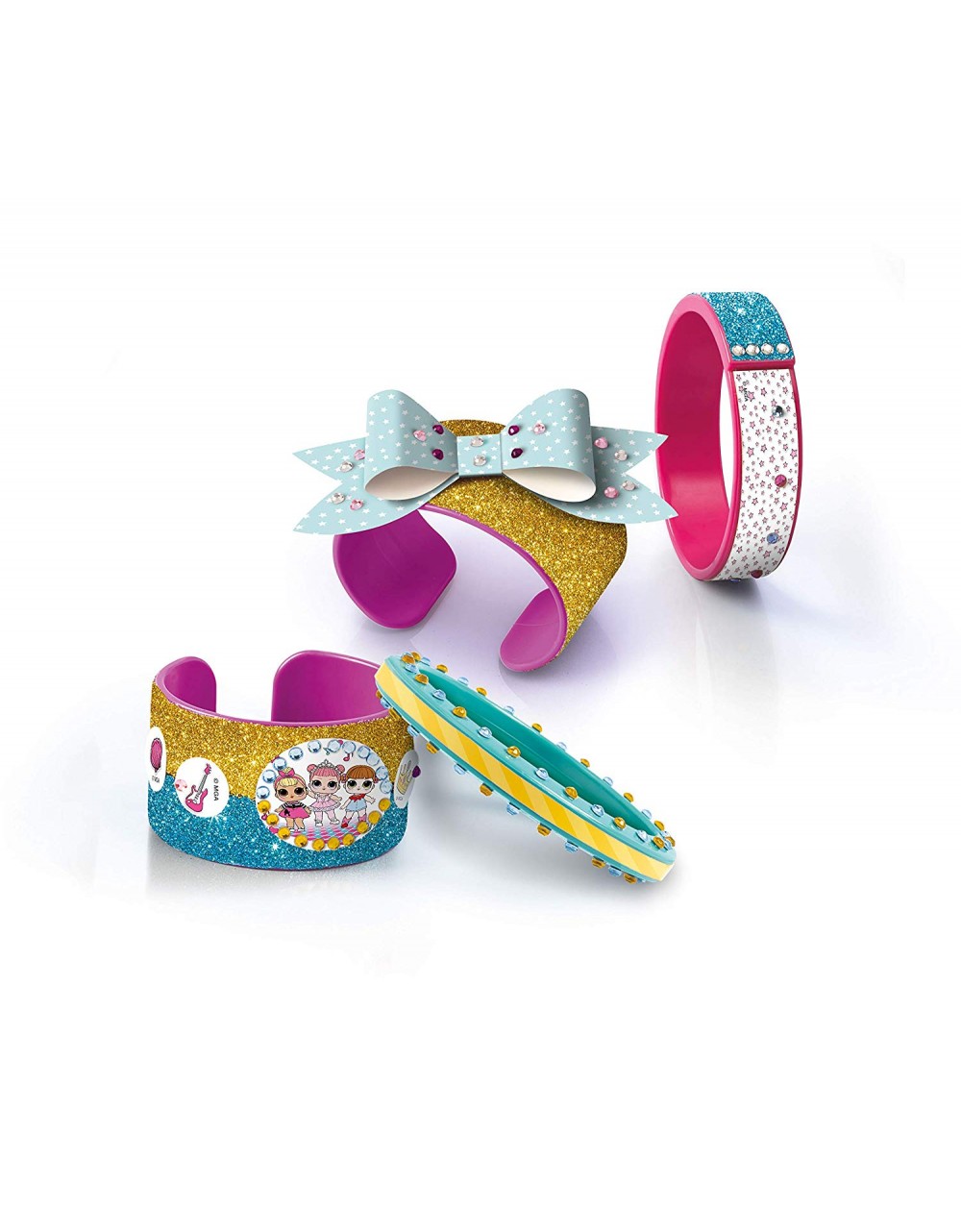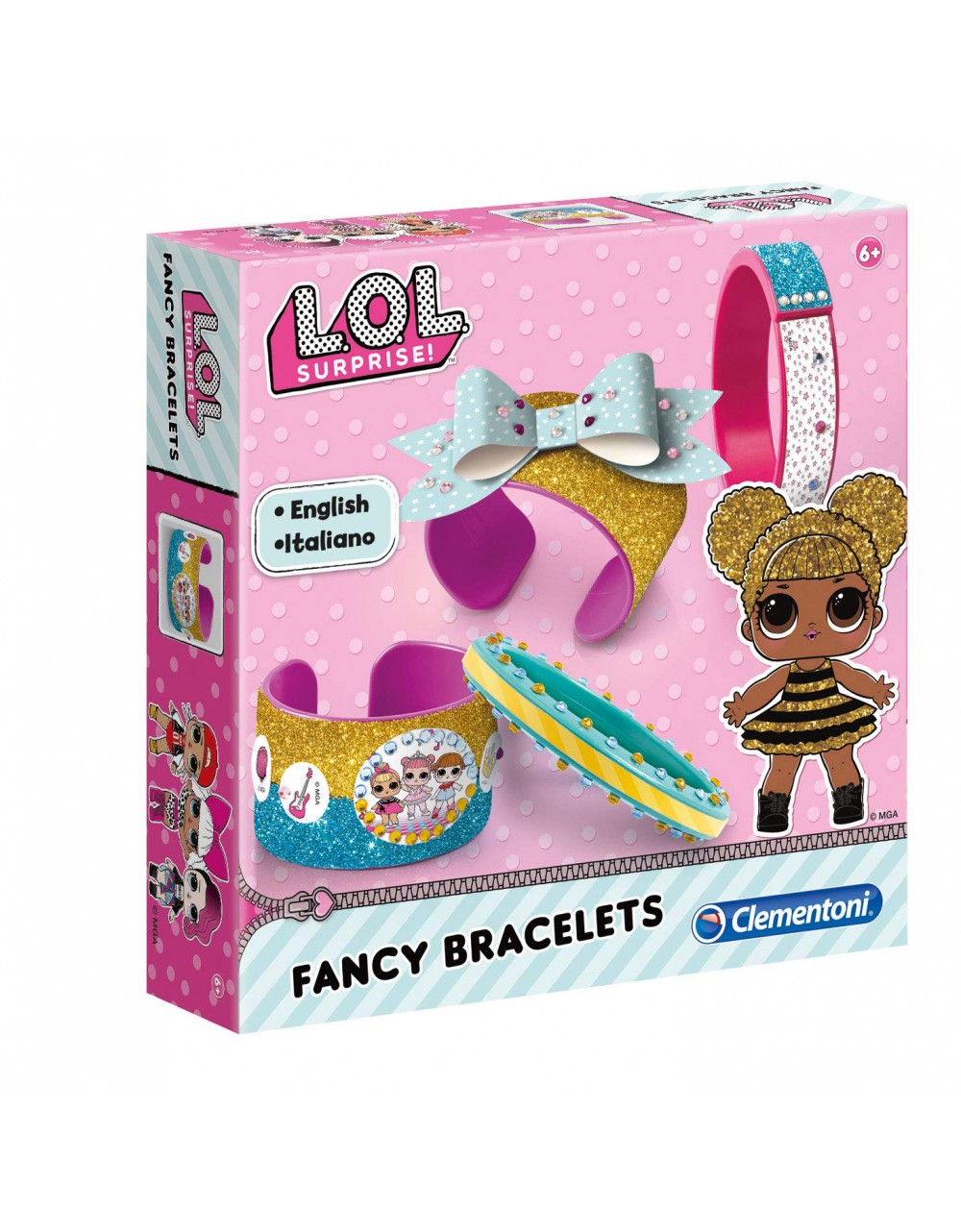 LOL - Fancy Bracelets Clementoni un kit précieux pour la fabrication de bracelets LOL. Avec plein de bracelets en plastique colorés à décorer de poudre scintillante, de gemmes et de stickers personnalisés... pour un style unique ! Stimule la dextérité et la créativité des petites filles.