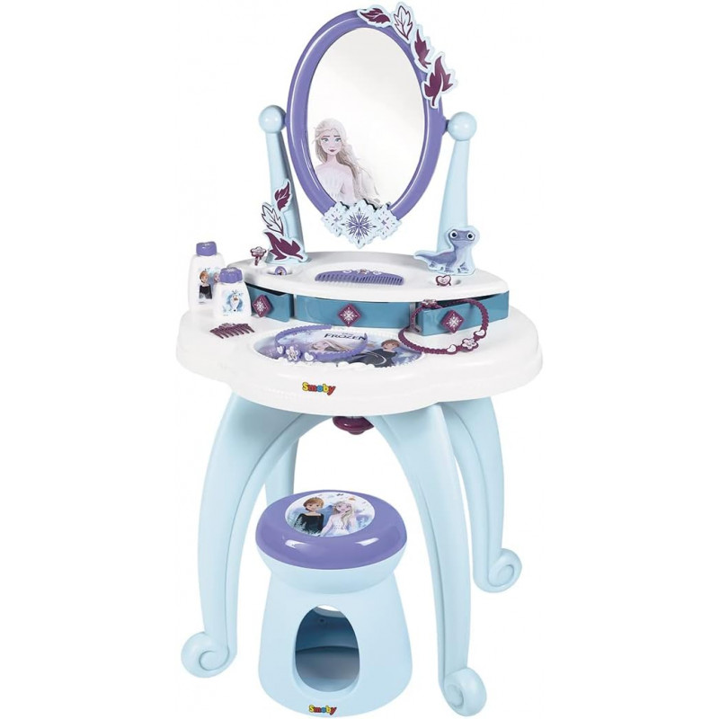 De plus, la coiffeuse La Reine des Neiges comprend 10 accessoires réalistes : un collier, un peigne, un bandeau, trois bagues, un bracelet et deux flacons, pour une expérience de jeu complète et stimulante. Les trois tiroirs permettent de ranger soigneusement tous ces précieux objets, tout en apprenant aux enfants l’importance de l’organisation.